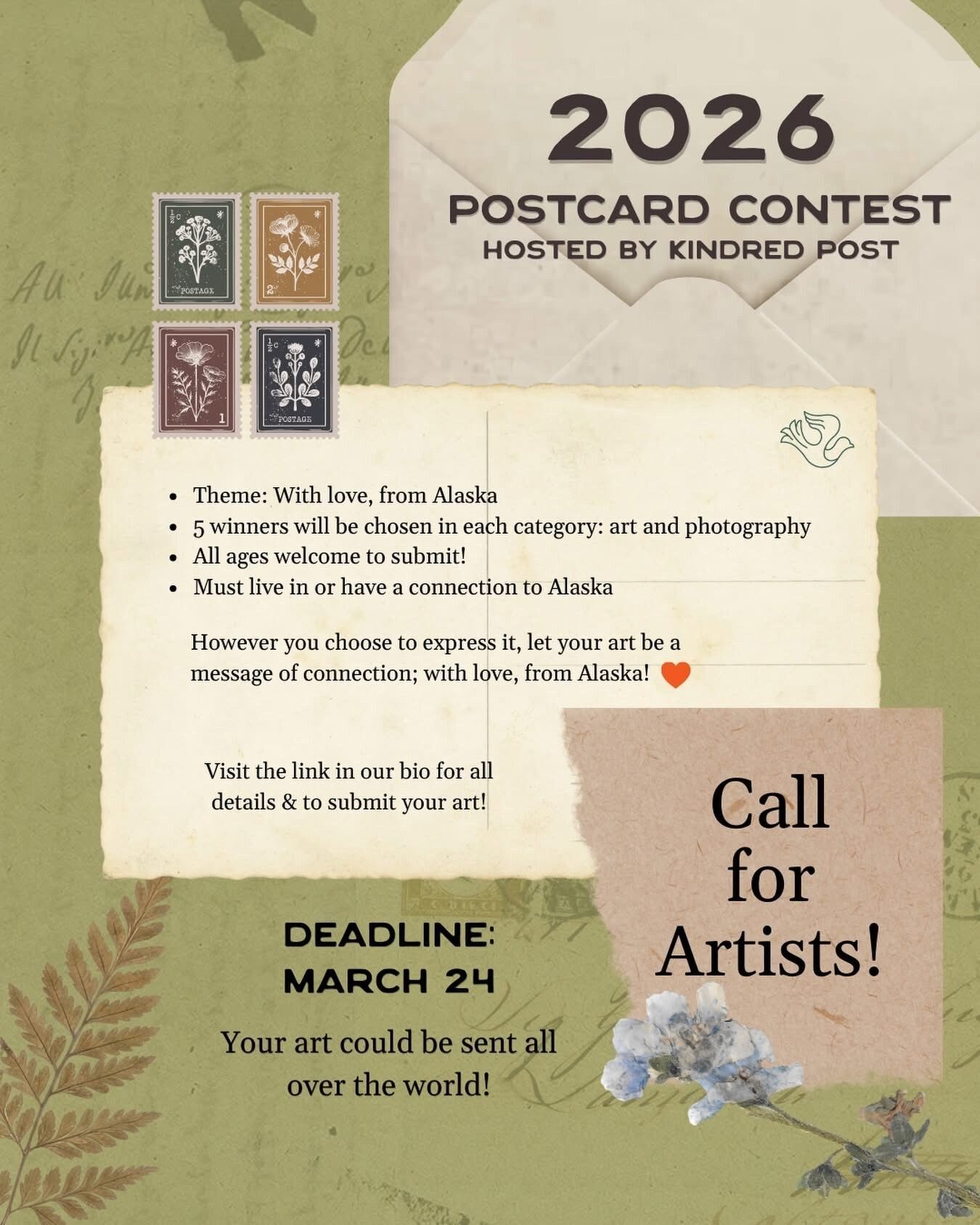 Kindred Post is thrilled to announce the 2026 Alaska Statewide Postcard Contest, and we’re officially calling on artists and photographers from across the state to submit their work!