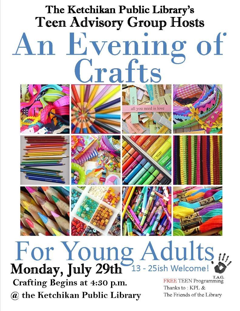 T.A.G. is hosting an evening of crafts for those age 13 to 25ish from 4:30 to 7:30 pm at the Ketchikan Public Library. Drop-in any time to create and make portable art using a variety of crafting supplies. Those participating in the teen summer program can earn two entries into the prize drawings as well as a space on the bingo cards. Free!