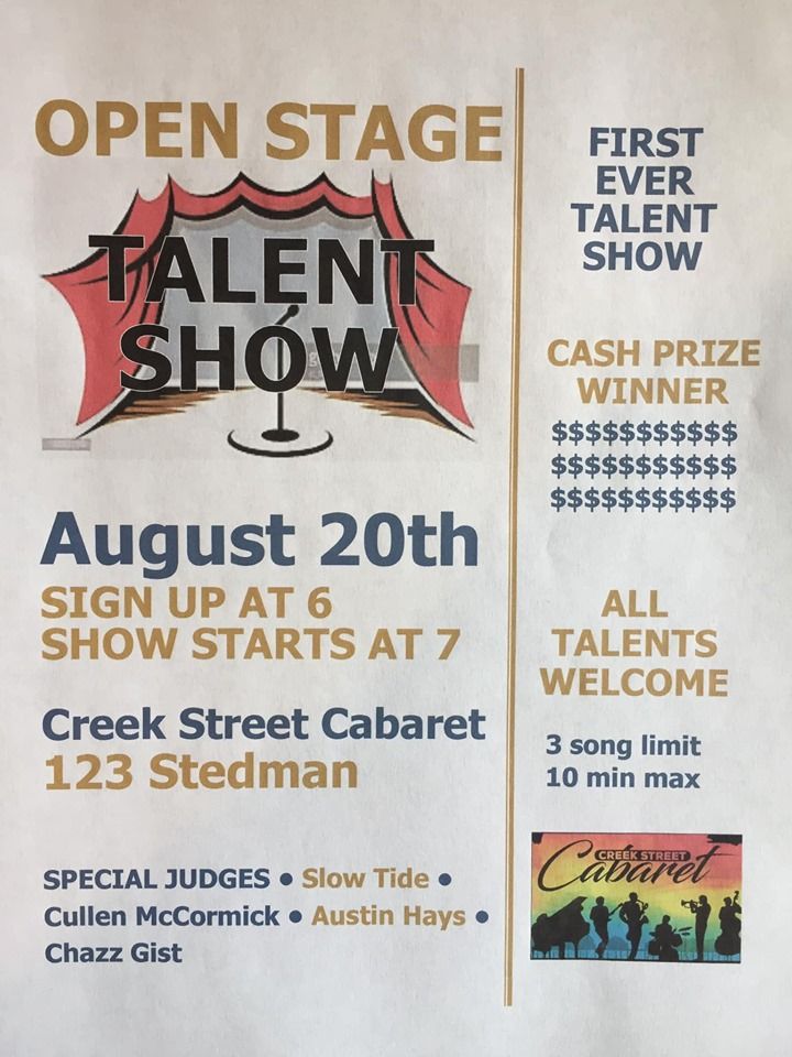 Call to all Talent!!! All Talents welcome. 3 piece limit, 10 min max. Cash prize to the winner!!! Special Guest Judges. Sign up at 6:00 pm. No pre-registration required, and no registration fees! Just sign up on the whiteboard. Must be 21 years of age or accompanied by a parent or legal guardian.