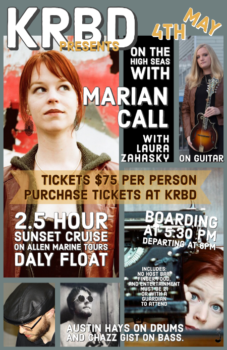"On the High Seas with Marian Call" Concert and Cruise boards at 5:30pm at the Allen Marine Dock and the cruise casts off at 6:00pm. Joining Marian Call are musicians Laura Zahasky, guitar; Austin Hays, drums; and Chazz Gist, bass. Tickets are $75 and include the concert, cruise finger food, and hopefully a BEAUTIFUL sunset!. No-host bar. You can call 225-9655 or drop by KRBD offices for tickets.