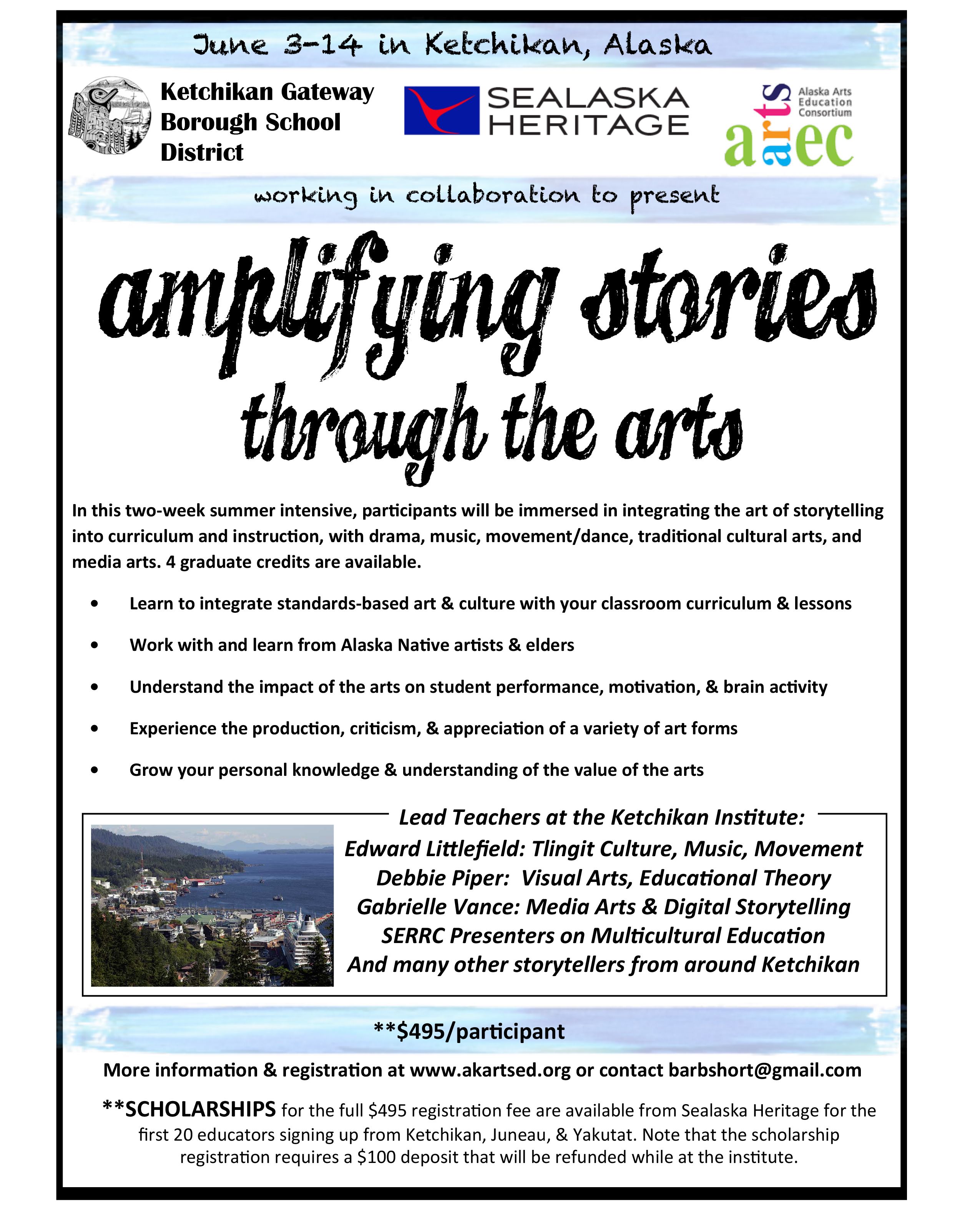 For Educators! Two week intensive. Participants will be immersed in integrating the art of storytelling into curriculum and instruction, with drama, music, movement/dance, traditional cultural arts, and media arts. Four graduate credits available! $495.00 Scholarships available