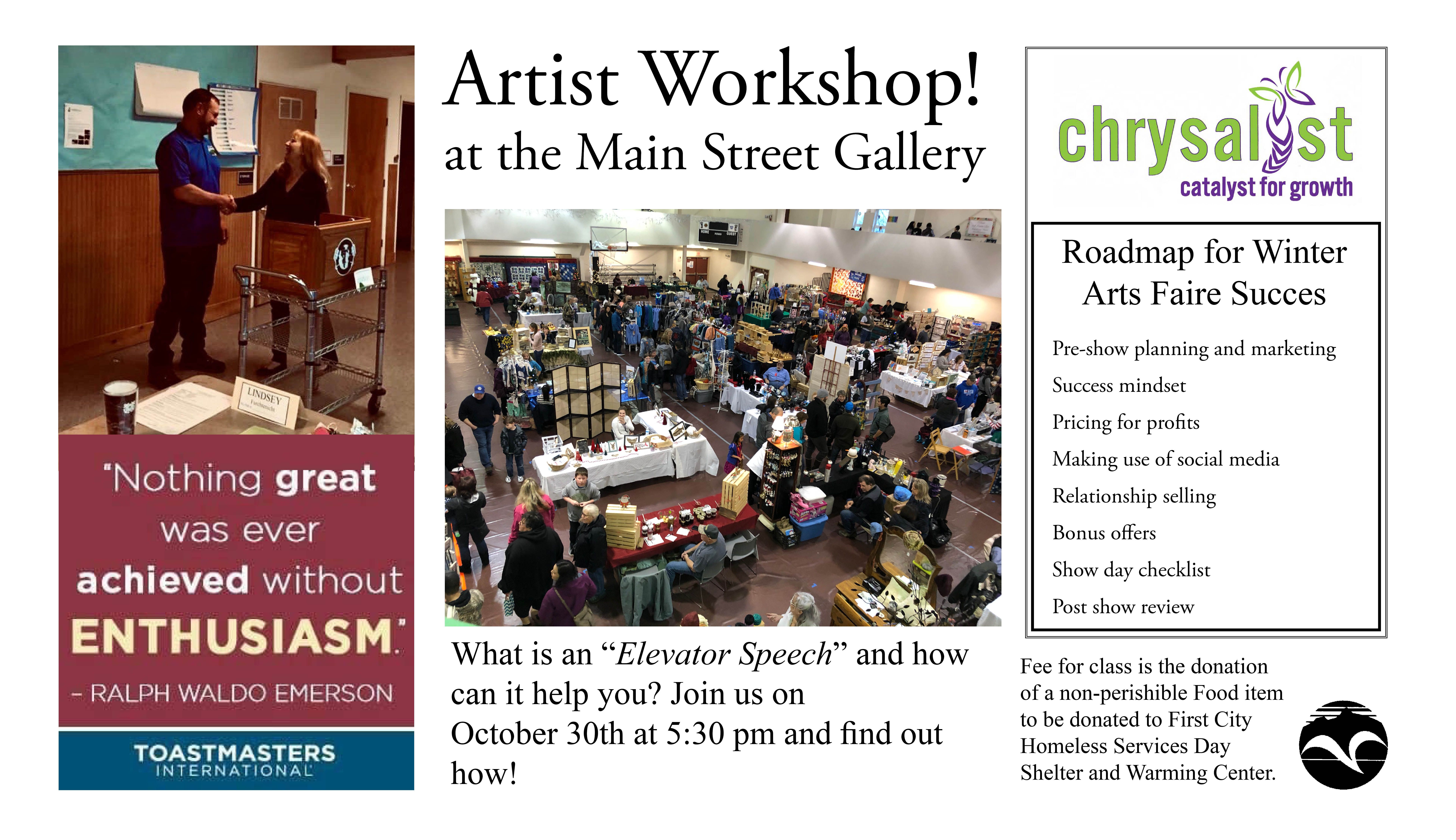 Are you an artist? Do you have a hard time articulating what you do to strangers? Learn how to take advantage of the first 60 secs. you meet someone! Bring a canned food donation to the Main Street Gallery on October 30th, and come take advantage of these great workshops designed especially for the artist, or small art business owner. Right in time for Winter Arts Faire Vendors!!!!