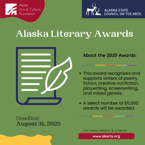 The 2025 Alaska Literary Awards recognize and support writers of poetry, fiction, creative nonfiction, playwriting, screenwriting, and mixed genres. Awards are made through the Alaska Arts and Culture Foundation and administered by the Alaska State Council on the Arts. In the 2025 cycle, a select number of $5,000 awards will be awarded to individuals.