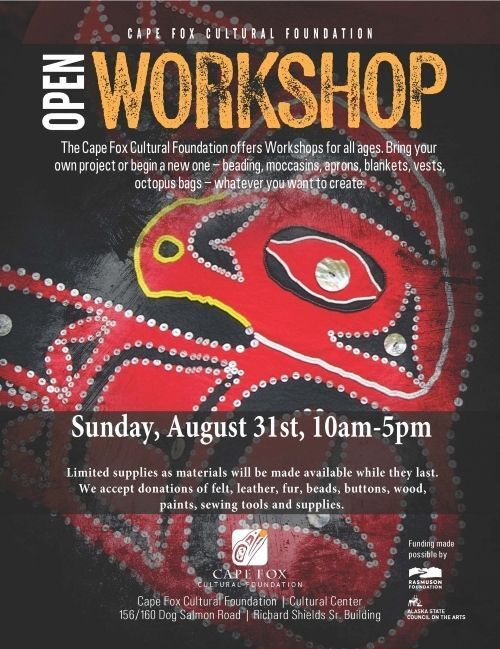 CFCF has another exciting Open Workshop this Sunday, August 31st, at the Cape Fox Cultural Foundation. All ages are welcome. Bring your projects, new or old, and let's create together.