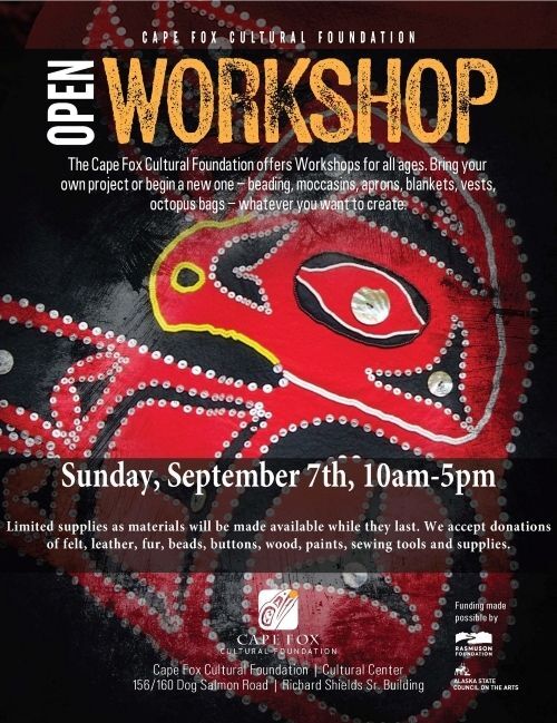 CFCF has another exciting Open Workshop at the Cape Fox Cultural Foundation. All ages are welcome. Bring your projects, new or old, and let's create together.
