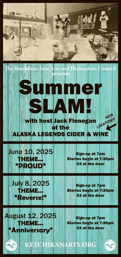 Join us for the Summer SLAM series! An impromptu (mostly true) storytelling event held the second Tuesday of every month at the Alaska Legends Cider & Wine. $3 at the door. Doors open at 7:00, and stories start at 7:30 pm. Themes are suggestions. Bring a friend and have some fun!