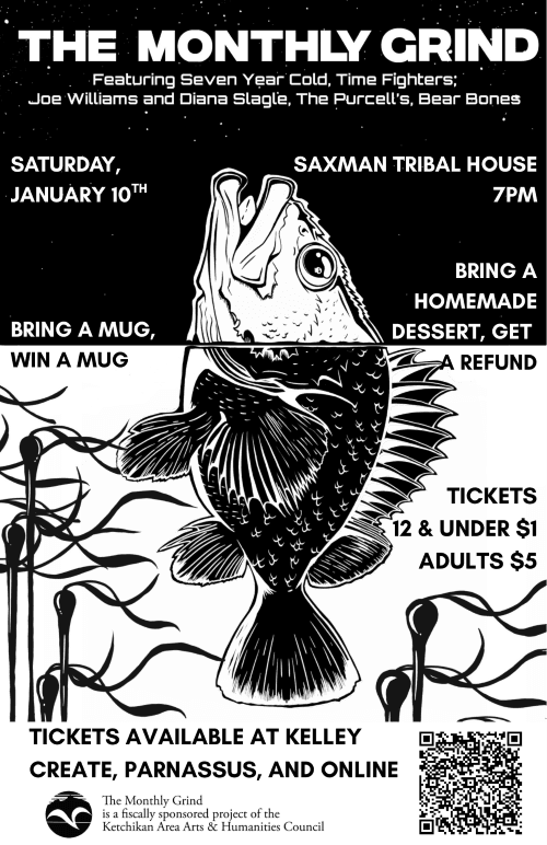 The Monthly Grind was created in 1990 as a monthly open mic meets coffee house performance series, running from September through May. The Monthly Grind, a fiscally sponsored program of the Ketchikan Area Arts and Humanities Council, is an all volunteer operation, including a Producer for each performance, dessert table organizers, ticket takers, sound, and of course the performers. The Monthly Grind is one of the essential events in Ketchikan that provides opportunities for young and old(er) to perform for a live audience, and which creates community and pride of place.
